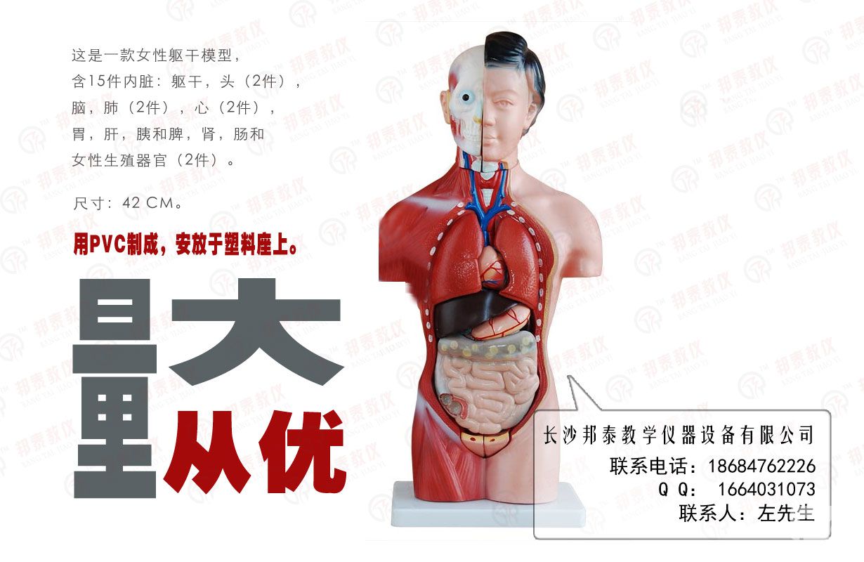 女性頭、頸、軀干模型含15件內臟:軀干,頭2件,腦,肺2件,心2件,胃,肝,胰和脾,腎,腸和女性生殖器官2件。