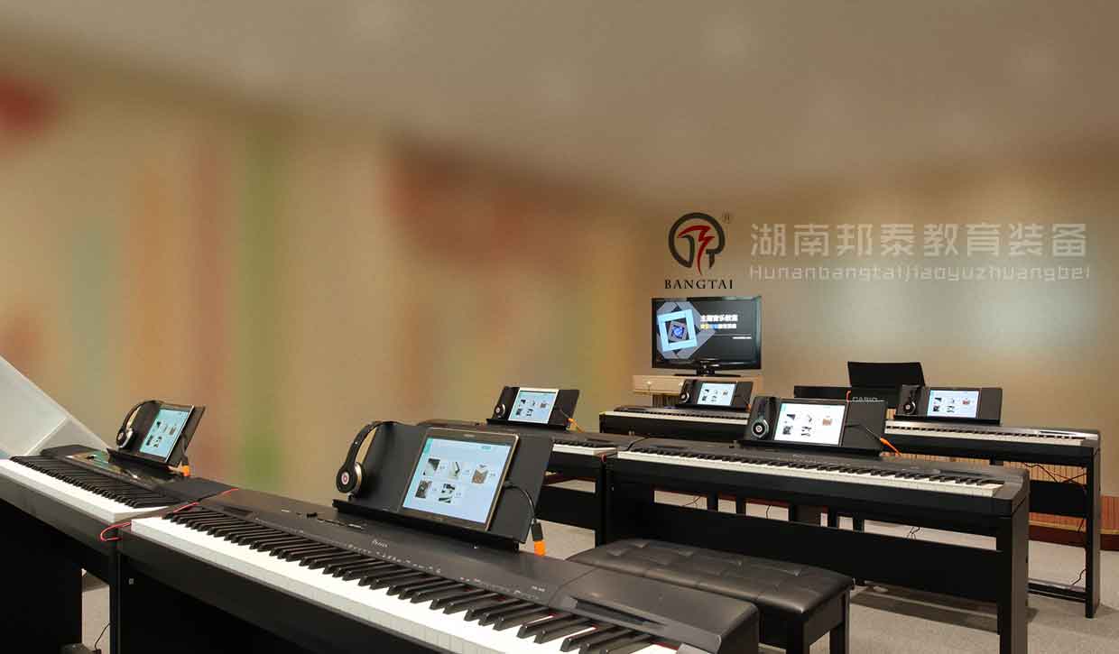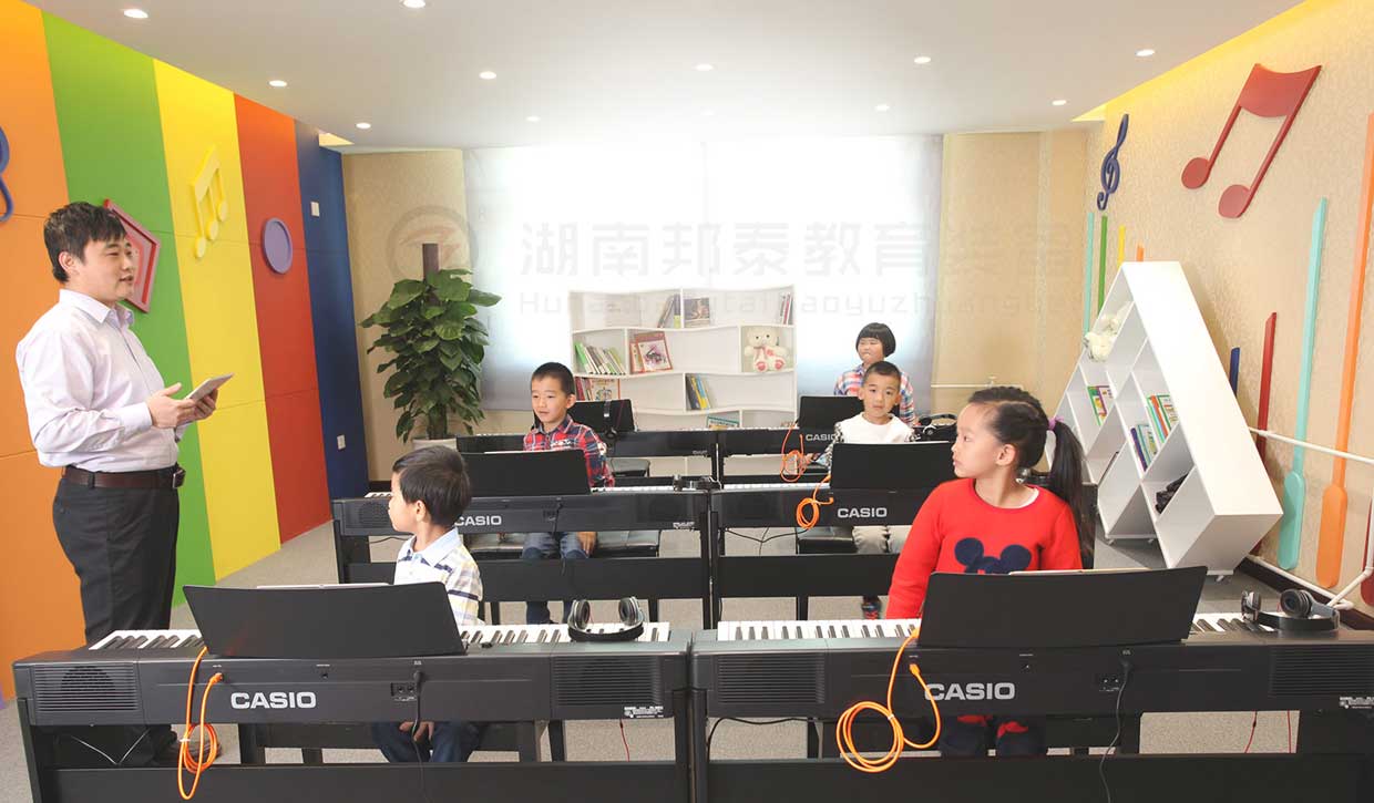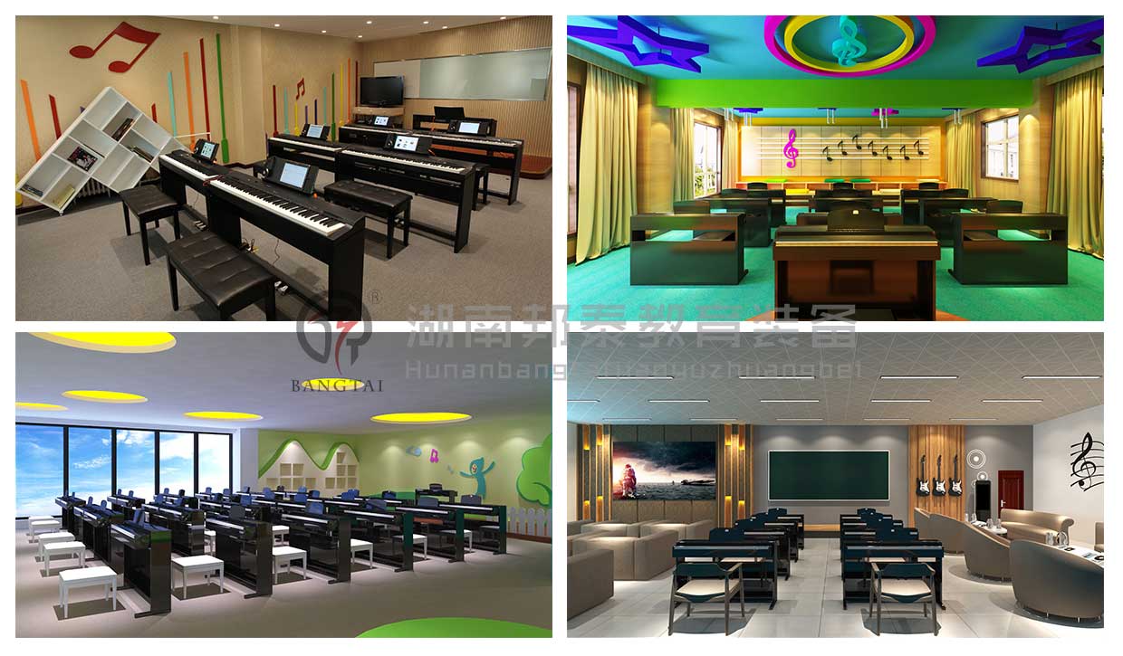 湖南邦泰教育裝備有限公司的音樂教室首先要配備有一套音樂欣賞與表達設備,音響、調音臺、功放、話筒、五線譜電教板、等多媒體相關設備必不可少,與此同時,硬件的配置少不了軟件資源的支撐,所以要配備音樂歌曲資源和多媒體教學軟件(軟件視小、初、高不同階段,配置不同軟件)。