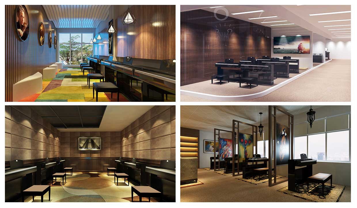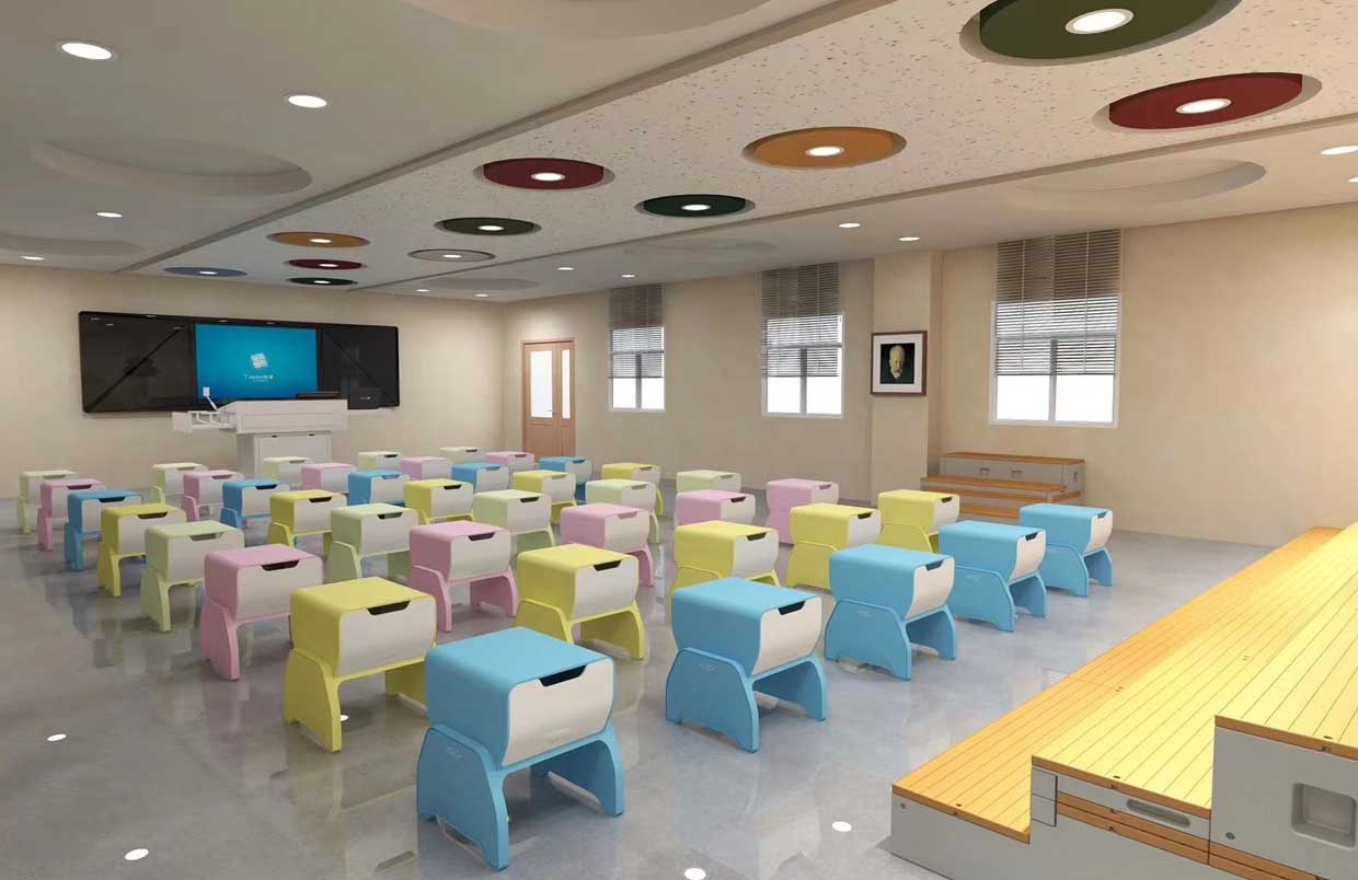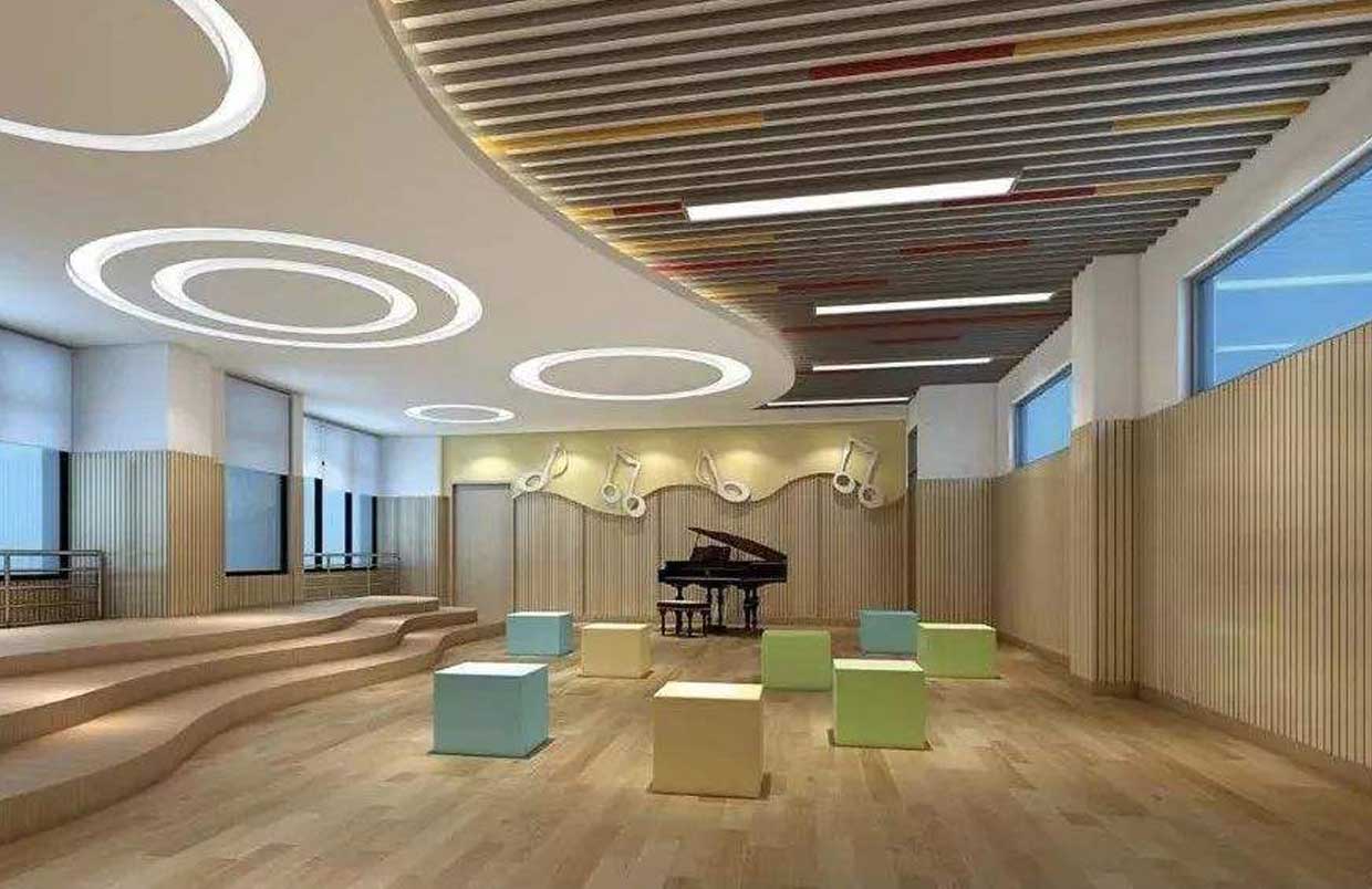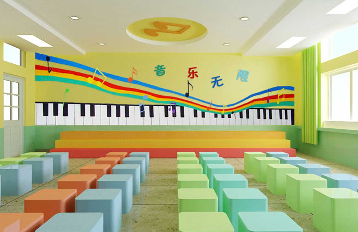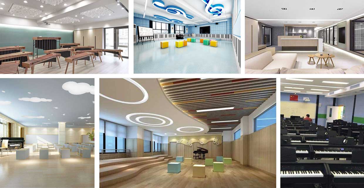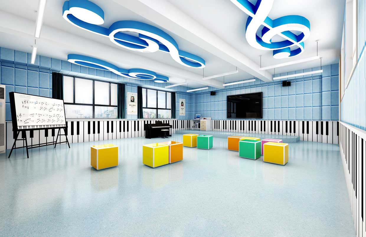對于教師的教學需要配備有譜架、教師桌椅等,而學生應有六面體凳和普通帶小桌板的椅子等。教室四周墻壁可懸掛音樂家掛圖、樂器掛圖、識譜知識掛圖、音樂故事簡介等,可以幫助學生了解關于音樂的相關知識。此外還可以用各種各樣彩色的音符點綴教室,色彩偏亮色,活躍而灑脫。可取教室一邊一塊區域可以設置儲物柜,用于儲藏各種樂器。