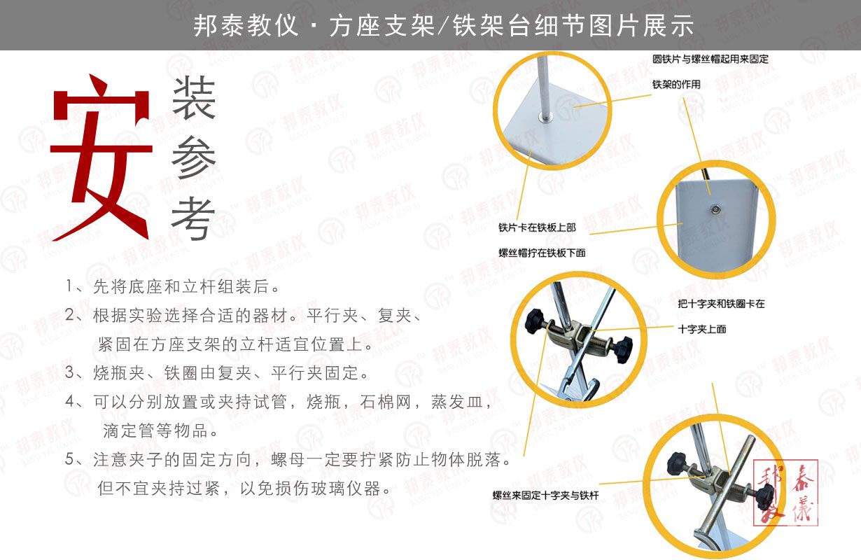 1、 方座支架,首先將底板方在平衡的桌上,將立柱裝在底板的前面孔上,根據實驗要求,調節鐵環、鐵夾于適當位置進行實驗。