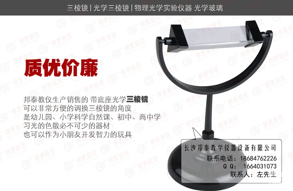 用途】:帶底座光學三棱鏡,可以非常方便的調換三棱鏡的角度,是幼兒園、小學科學自然課、初中、高中、學習光的色散必不可少的器材,也可以作為小朋友開發智力的玩具,三棱鏡比較大,可以作為學校老師課堂演示實驗用。